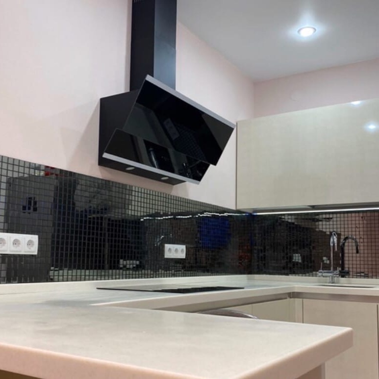 Зеркальная плитка в качестве кухонного фартука – довольно редкий выбор, но от этого не менее интересный. Заказчик выбрал мелкую мозаику цвета «графит», который прекрасно сочетается с темными цветами вытяжки и варочной панели. Лаконичная цветовая гамма кухни позволяет зеркальной мозаике раскрыть всю свою красоту. Действительно, панно является главным украшением и изюминкой этого интерьера.