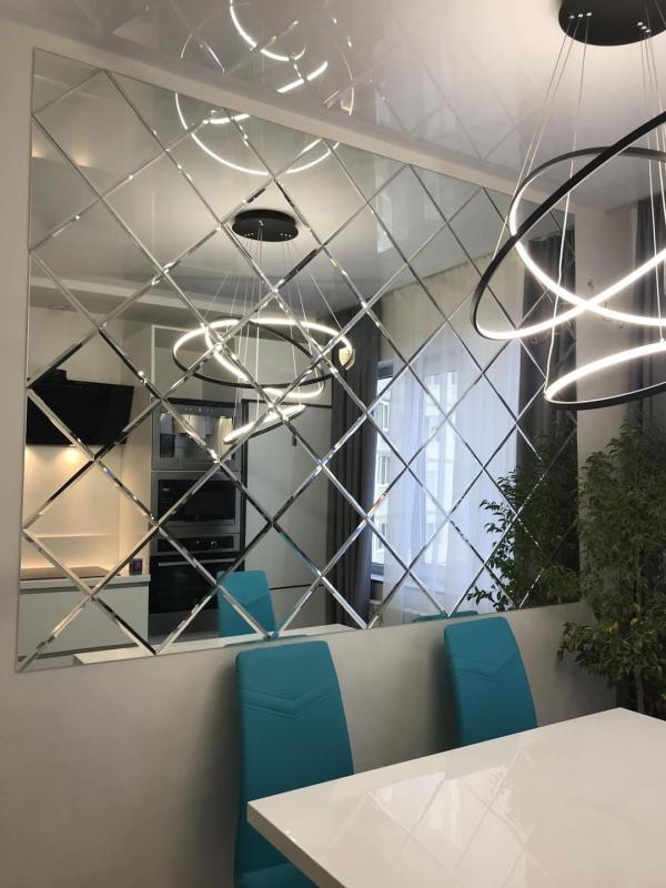 Хорошие дизайнеры проделывают с помощью зеркальных панно удивительные трюки. Расположив ромбовидные элементы над обеденной зоной, можно получить эффект превращения маленькой кухни в большую столовую.