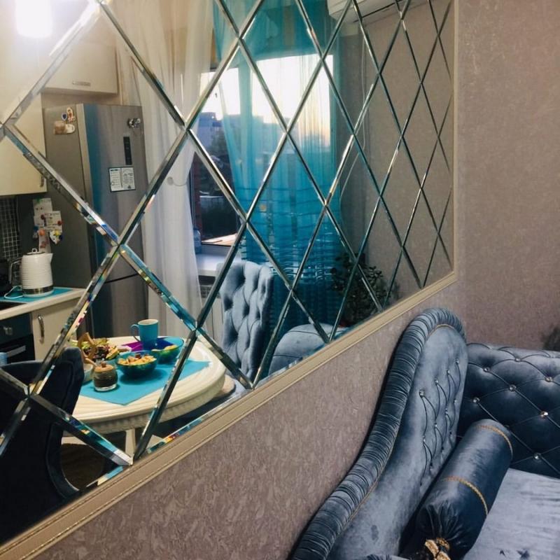 Использована квадратная серебристая зеркальная плитка размером 18х18.